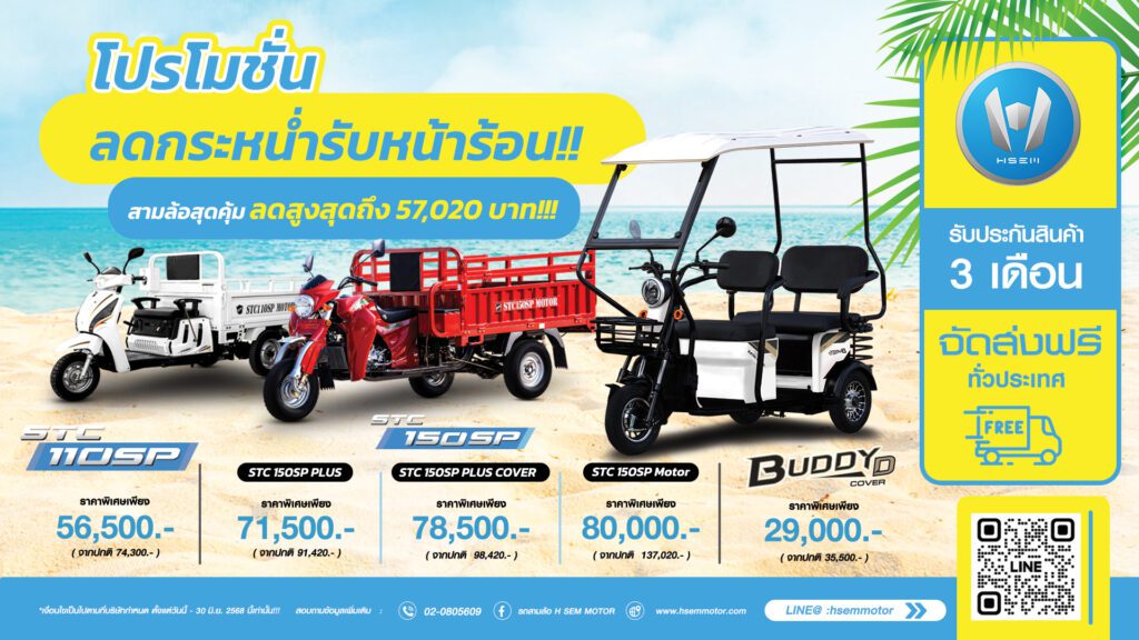 เอช เซม รับหน้าร้อนด้วยราคาสุดพิเศษ รถสามล้อ ทั้งแบบไฟฟ้าและเครื่องยนต์ เริ่มต้นเพียง 29,000 บาท พร้อมรับประกัน 3 เดือนและจัดส่งฟรี! ทั่วประเทศ ตัดสินใจด่วน !! สินค้ามีจำนวนจำกัด