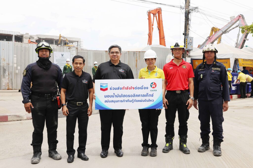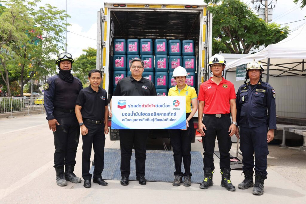 เมื่อเร็ว ๆ นี้ บริษัท เชฟรอน (ไทย) จำกัด ผู้ผลิตและจัดจำหน่ายผลิตภัณฑ์น้ำมันหล่อลื่นคาลเท็กซ์ ฮาโวลีน และคาลเท็กซ์ เดโล่ นำโดย นายสันติศักดิ์ ไทยพัฒน์ ประธานกรรมการและผู้จัดการใหญ่ บริษัท เชฟรอน (ไทย) จํากัด (ที่ 3 จากซ้าย) มอบน้ำมันไฮดรอลิค คาลเท็กซ์ แรนโด้ จำนวนรวม 1,620 ลิตร ให้แก่ นางสาวภัทร์กร สินสุข ผู้อำนวยการเขตจตุจักร กรุงเทพมหานคร (ที่ 3 จากขวา) เพื่อสนับสนุนการปฏิบัติภารกิจของเจ้าหน้าที่กู้ภัยในการใช้งานกับเครื่องจักรในการกู้ภัย อาทิ รถขุด รถเครน รถตัก และเครื่องมืออื่น ๆ สำหรับปฏิบัติการค้นหาผู้สูญหายที่คาดว่ายังติดอยู่ใต้ซากอาคารสำนักงานตรวจเงินแผ่นดิน (สตง.) ที่ถล่มลงมาหลังเหตุการณ์แผ่นดินไหว ให้เป็นไปได้อย่างราบรื่นและมีประสิทธิภาพมากยิ่งขึ้น ณ ศูนย์บัญชาการเหตุการณ์ จตุจักร กรุงเทพฯ