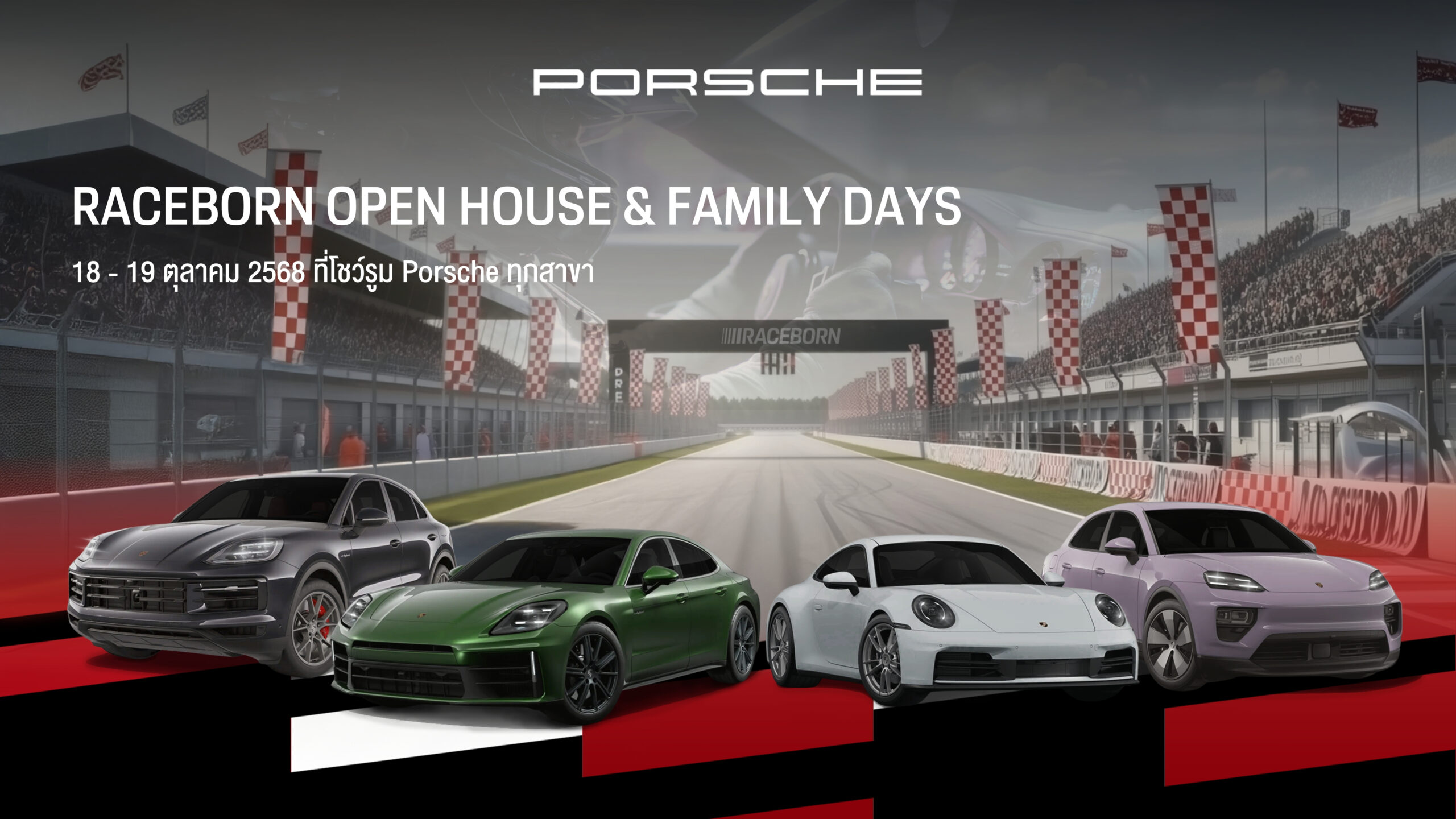 เตรียมพบกับงาน Raceborn Open House & Family Days ซึ่งจัดขึ้นโดยปอร์เช่ ประเทศไทย ระหว่างวันที่ 18 – 19 ตุลาคม 2568 ณ โชว์รูมปอร์เช่อย่างเป็นทางการพร้อมกันทุกแห่ง เตรียมมอบประสบการณ์สุดพิเศษให้แก่ผู้ชื่นชอบและผู้ที่สนใจในยนตรกรรมปอร์เช่ ภายในงานจะได้พบกับ การจัดแสดงยนตรกรรมสปอร์ตหลากหลายรุ่นในลวดลายรถแข่งในตำนาน และสำหรับผู้ที่เข้าร่วมการทดลองขับภายในงานจะได้ทดลองขับร่วมกับนักแข่งมืออาชีพและผู้เชี่ยวชาญด้านการขับขี่ที่ได้รับการรับรองจากปอร์เช่ นอกจากนี้ผู้ที่จองและรับรถในช่วงเวลาที่กำหนดจะได้ลุ้นรับแพ็คเกจร่วมขับรถสุดเอ็กซ์คลูซีฟ ณ Porsche Experience Centre กรุงโตเกียว ประเทศญี่ปุ่น* และรับข้อเสนอพิเศษแห่งปีสำหรับรุ่นมาคันน์, ไทคานน์, คาเยนน์ และพานาเมรา รวมมูลค่าสูงสุดกว่า 1 ล้านบาท สำหรับผู้ที่จองและรับมอบรถยนต์ภายใน 31 ตุลาคม 2568 เท่านั้น*
