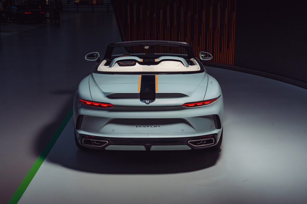 การออกแบบของ Batur Convertible รุ่นแรกได้สะท้อนถึงสมรรถนะอันเหนือชั้นของระบบส่งกำลัง รุ่น W12 เจ้าของขุมพลังกว่า 740 แรงม้า พร้อมด้วยเฉดสีเทา-เงิน Opalite ที่แวววาวอยู่บนตัวถังตัดกับแถบแข่งในเฉดสีดำเงาที่ผนวกเข้ากับการตกแต่งด้วยแถบเฉดสีส้ม Mandarin ทั้งสองฝั่ง แถบแข่งมาพร้อมกับการลงสีพิเศษแบบฝังแน่นเข้ากับตัวถังของรถอย่างแนบเนียนจากฝากระโปรงหน้าตลอดแนวไปยังฝากระโปรงหลังต่อเนื่องไปยังส่วนท้ายบริเวณตราสัญลักษณ์ของเบนท์ลีย์ องค์ประกอบเหล่านี้เชื่อมโยงกันด้วยงานปักที่ออกแบบเฉพาะในรูปแบบเดียวกันบริเวณหลังเบาะโดยสาร และกระจังหน้าแบบเมทริกซ์อันโดดเด่นที่ตกแต่งด้วยเฉดสีดำ Beluga แบบเงา พร้อมด้วยไฮไลท์เฉดสีส้ม Mandarin พร้อมกับล้ออัลลอยด์แบบ 5 ก้านที่ได้รับการรังสรรค์ด้วยเฉดสีที่คอนเทราสต์เช่นเดียวกัน
