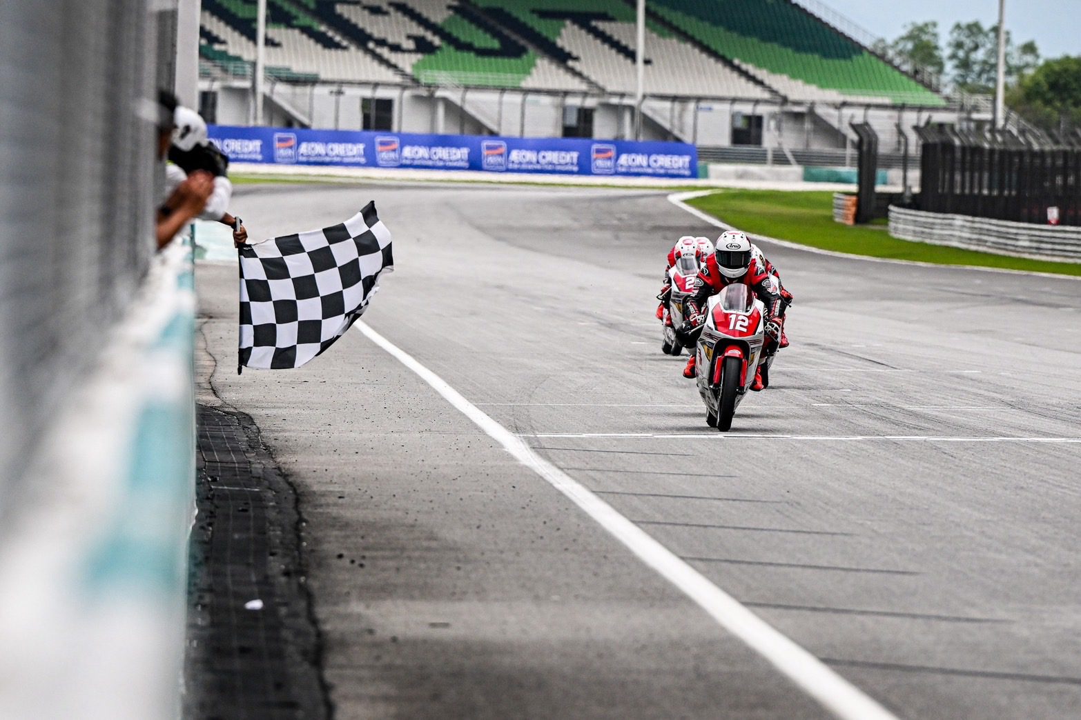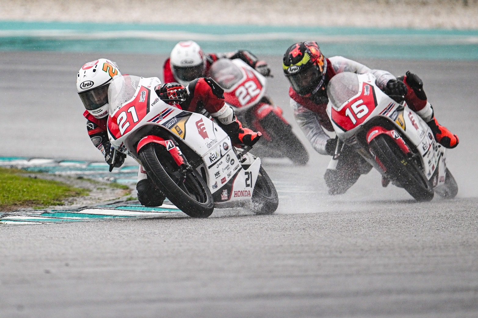 การแข่งขันเรซแรก ประลองความเร็วท่ามกลางสายฝน 11 รอบ “เขียน” เสือเขียน มีเดช หมายเลข 18 ดาวรุ่งไทยเจ้าของโพล โชว์ฟอร์มเด่นขี่ฝ่าสายฝน ก่อนเข้าสู่ 5 รอบสุดท้าย กลุ่มนำประชันความเร็วแบบต่อเนื่องทุกโค้ง จบด้วย “อาบิมานยู บินตัง” หมายเลข 26 จากอินโดนีเซีย คว้าแชมป์ไปครอง ตามมาด้วย “เขียน-เสือเขียน” ในอันดับ 2 และ “ตะวัน” ภีมะ พจนอารีย์ หมายเลข 21 ทะยานขึ้นโพเดียมอันดับ 3 ปลดล็อกโพเดียมแรกได้สำเร็จ