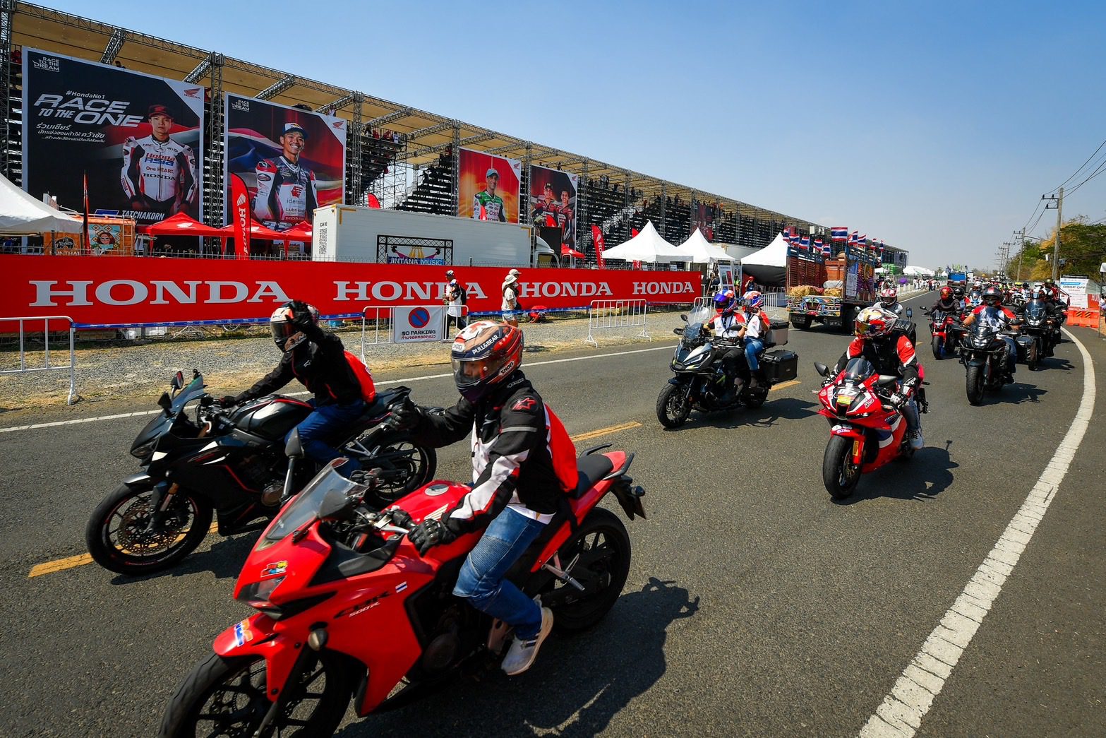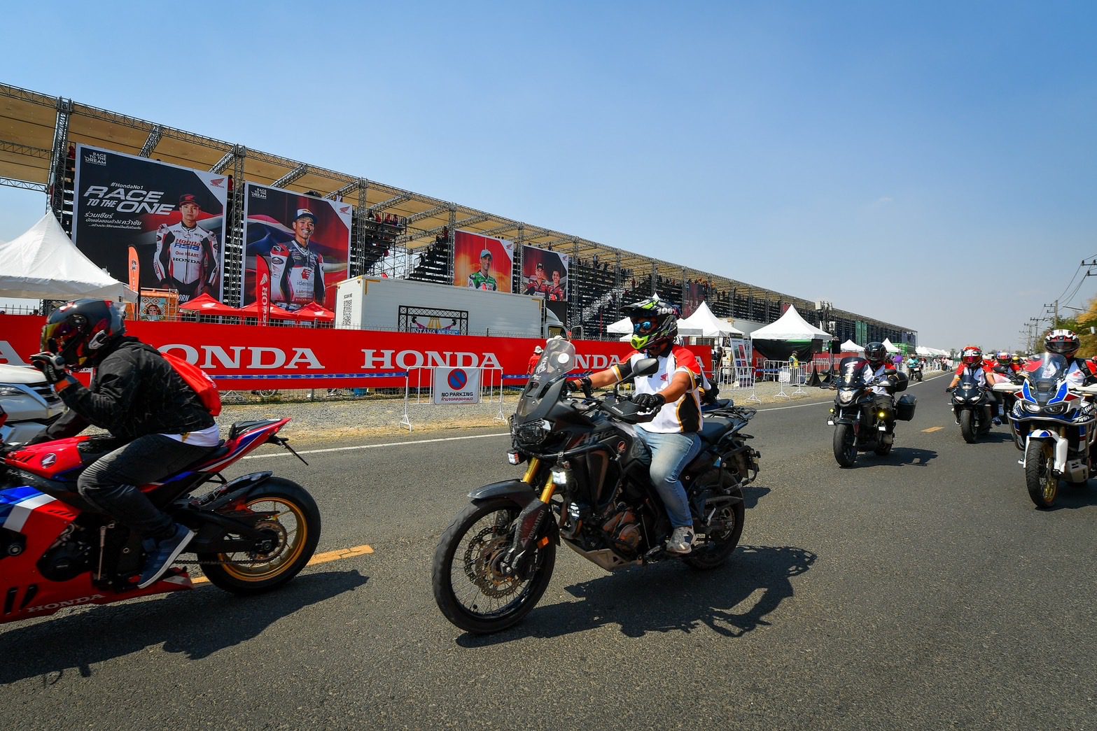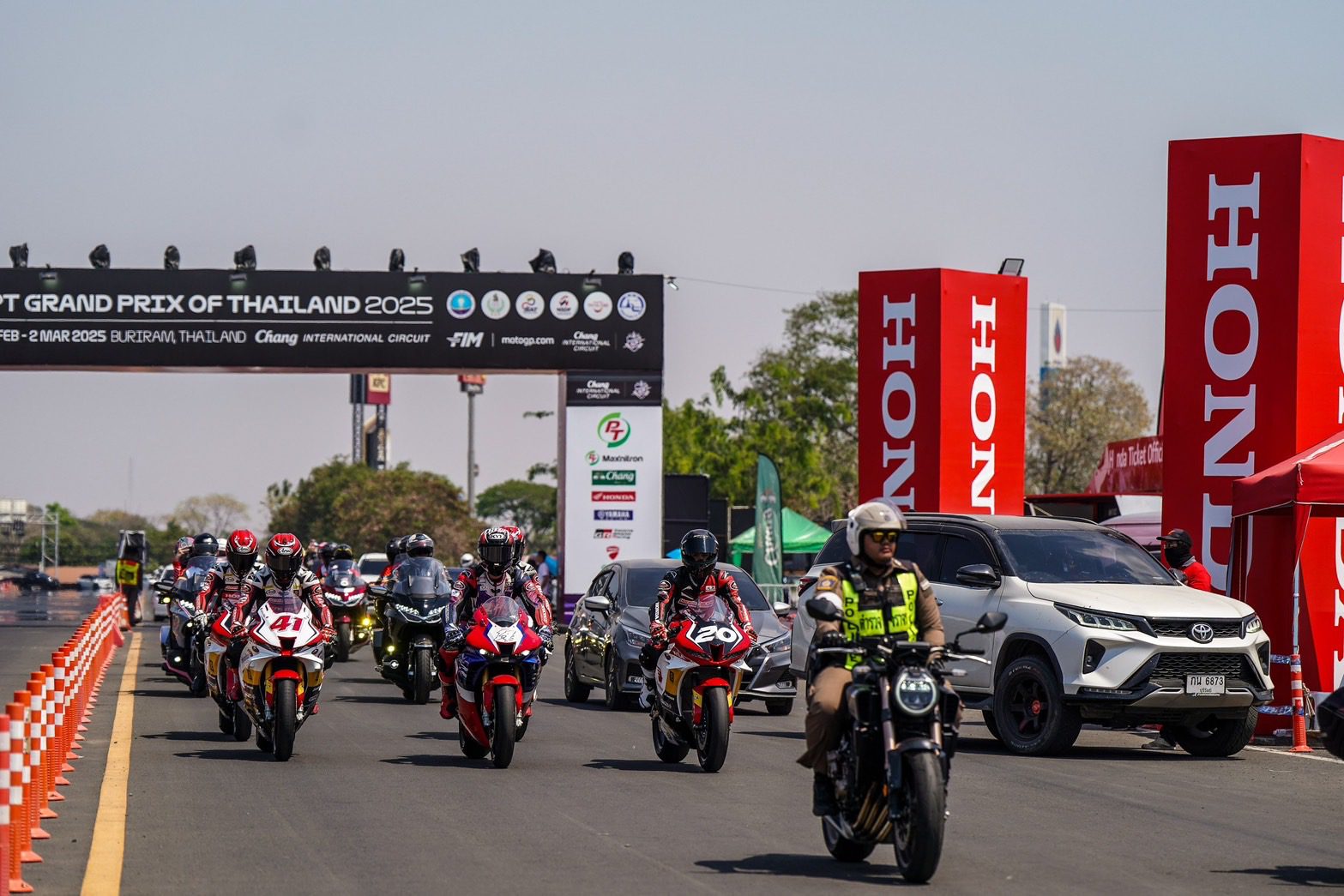 “ไทยฮอนด้า” เปิดโอกาสให้ลูกค้ารถจักรยานยนต์ฮอนด้าบิ๊กไบค์จากร้าน Honda BigWing ทั่วประเทศ ได้เข้าร่วมสร้างหน้าประวัติศาสตร์ “Race to The One เชียร์ไทยให้เป็นหนึ่ง” ร่วมขับขี่ “Honda Road Trip to ThaiGP 2025” รวมตัวกันที่ จังหวัดบุรีรัมย์ โดยทัพนักบิดชั้นแนวหน้าของเมืองไทย “Honda Racing Thailand” ร่วมขับขี่รถจักรยานยนต์ฮอนด้าบิ๊กไบค์ นำขบวนคาราวานเข้าสู่สนามแข่งขัน สนามช้าง อินเตอร์เนชั่นแนล เซอร์กิต อย่างยิ่งใหญ่ ไม่ว่าจะเป็น ยอดนักบิดที่มีประสบการณ์ในศึกเวิลด์กรังด์ปรีซ์ เฮดโค้ช “ฟิล์ม” รัฐภาคย์ วิไลโรจน์ อดีตนักบิดโมโตทูคนแรก, “ชิพ” นครินทร์ อธิรัฐภูวภัทร์ อดีตนักบิดโมโตทรี ผู้ครองตำแหน่งแชมป์รุ่นใหญ่ MSBK1000 ปีล่าสุด, โค้ชนักบิดสาวแกร่งมากฝีมือ “มุกข์” มุกข์ลดา สารพืช และยอดนักบิดดาวรุ่งของไทย “ข้าวก้อง” จักรีภัทร พฤฒิสาร, “มิกซ์” ธนัช ละอองปลิว และ “ไม้คิว” เกียรติศักดิ์ สิงหพงศ์ โดยมีจุดบริการที่จอดรถ Exclusive จอดรถจักรยานยนต์ Big Bike Parking รองรับร่วมกว่า 200 คัน