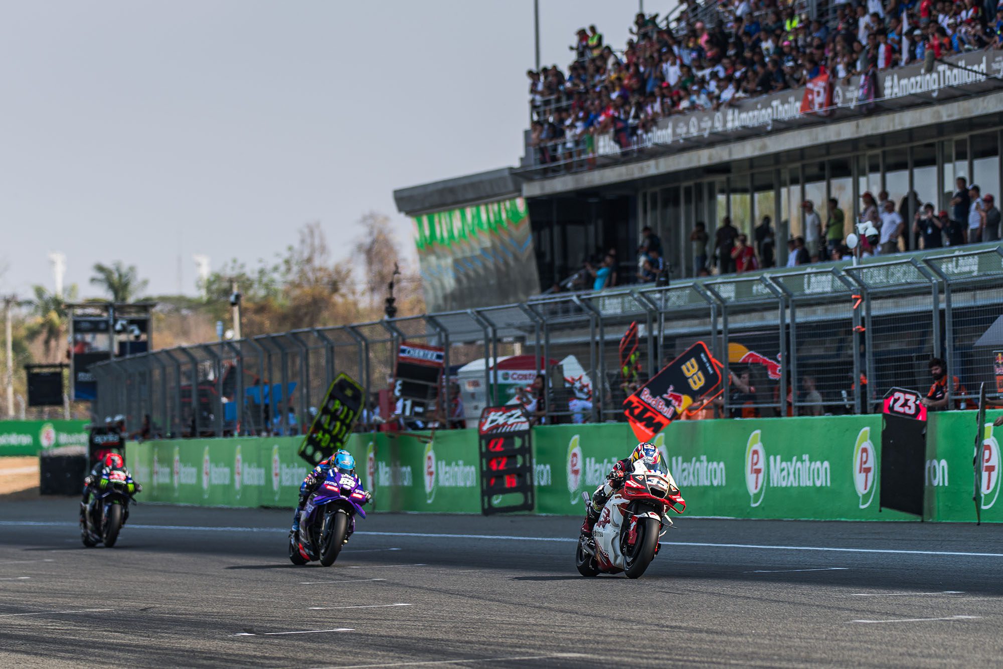 ศึก โมโตจีพี 2025 ที่มาเปิดฤดูกาลที่ไทย ภายใต้ชื่อ พีที กรังด์ปรีซ์ ออฟ ไทยแลนด์ ผ่านการแข่งขัน “สปรินต์เรซ” ในบ่ายวันเสาร์ที่ 1 มีนาคม 2568 ที่สนามช้าง อินเตอร์เนชั่นแนล เซอร์กิต จ.บุรีรัมย์ ชิงชัยทั้งสิ้น 13 รอบสนาม ต่อหน้าแฟนความเร็วหลายหมื่นคนที่หลั่งไหลเข้าสู่สนามอย่างหนาตา ไม่แพ้กับวันแข่งขัน