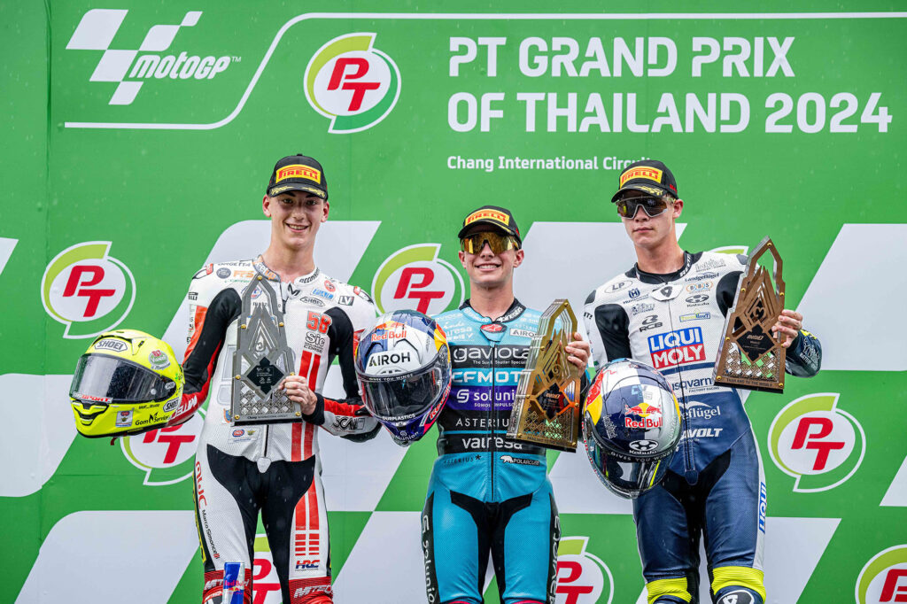 โดยผลการแข่งขันในรุ่นเล็กอย่าง โมโตทรี ต้องมาตัดสินกันถึงโค้งสุดท้าย ชัยชนะตกเป็นของ “ดาวิด อลอนโซ” นักบิดโคลัมเบียนแชมป์โลกปีนี้จาก ซีเอฟ โมโต กาวิโอตา อัสพาร์ ทีม ด้วยเวลา 20 นาที 29.345 วินาที เฉือน “ลูก้า ลูเน็ตต้า” นักบิดอิตาเลียนจาก ซิค58 สควอดร้า คอร์เซ อันดับ 2 เพียง 0.353 วินาที ตามด้วย “คอลลิน วายเยอร์” นักบิดดัตช์จาก ลิควิ โมลี ฮัสควาน่า อินแท็ค จีพี ตามหลัง 0.522 วินาที ส่วน “ก๊องส์” ธัชกร บัวศรี นักบิดไทยจาก ฮอนด้า ทีม เอเชีย ฟอร์มเยี่ยมสตาร์ตจากกริดที่ 25 บิดคว้าอันดับ 17 ตามหลังผู้ชนะ 17.262 วินาที