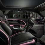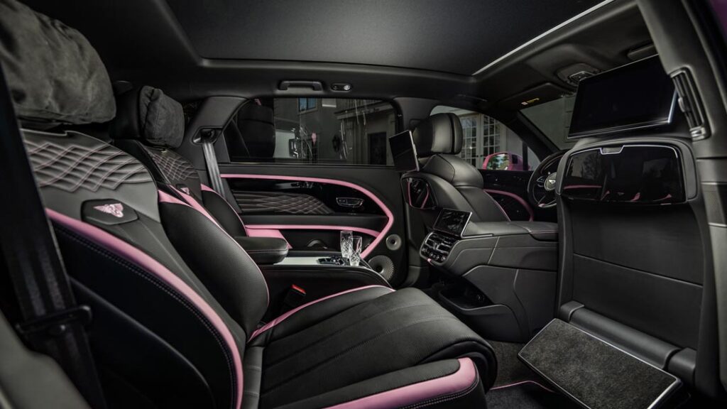 สำหรับ Bentayga EWB เฉดสีพิเศษ การตกแต่งภายนอกตัวถังได้ผสานเข้ากับภายในห้องโดยสารที่ตกแต่งด้วยหนังและด้ายเฉดสี Cherry Blossom พร้อมด้วยโลโก้แบรนด์รถยนต์เบนท์ลีย์ที่ปักลายบนเบาะโดยสาร โดยลูกค้าเลือกติดตั้งช่องเก็บความเย็น Mulliner Bottle Cooler ที่มากับฝากระจกฝ้าแบบ Soft Close ระหว่างเบาะโดยสารแบบ Airline Seat Specification ภายในห้องโดยสารเพื่อความสะดวกสบายสำหรับผู้โดยสารตอนหลัง