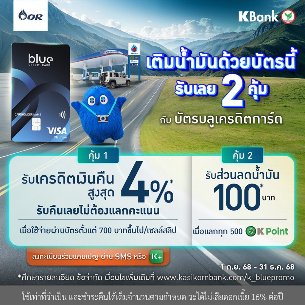 “บัตรบลูเครดิตการ์ด (Blue Credit Card)” บัตรเครดิตร่วมระหว่างธนาคารกสิกรไทย กับ บริษัท ปตท. น้ำมันและการค้าปลีก จำกัด (มหาชน) หรือ โออาร์ เพิ่มความคุ้มค่า 2 ต่อ เมื่อเติมน้ำมัน ณ สถานีบริการ พีทีที สเตชั่น และจ่ายด้วยบัตรบลูเครดิตการ์ด