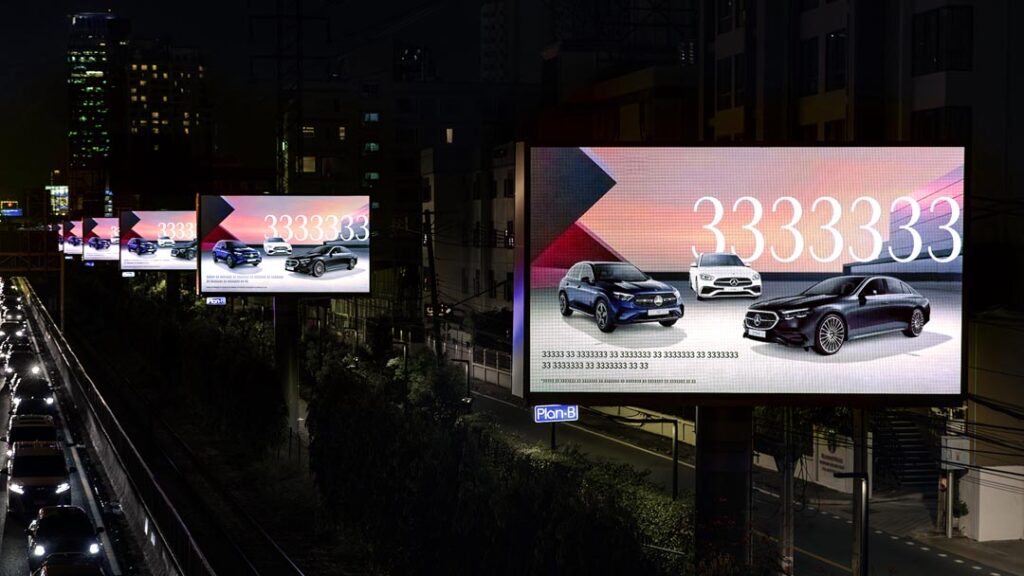 ในช่วงสัปดาห์ที่ผ่านมา คนไทยหลายคนอาจเห็นตัวเลข “333” ที่ปรากฏอยู่บนโซเชียลมีเดีย และสื่อนอกบ้านแบบ Digital Out of Home (DOOH) ที่กระจายอยู่ตามพื้นที่ใจกลางกรุงเทพมหานคร ซึ่งมาในรูปแบบของโฆษณาที่เนื้อหาทั้งหมดขึ้นเป็นเลข 3333333333 ไม่ว่าจะเป็นในส่วนของหัวข้อและรายละเอียดต่างๆ จนอาจเกิดข้อสงสัยมากมายว่าเลข 3 ที่ว่านี้ สื่อถึงอะไร แต่ชิ้นงานโฆษณาดังกล่าวก็ยังมีจุดสังเกตที่พอให้ผู้คนเดาออกว่าสิ่งนี้ต้องเกี่ยวข้องกับแบรนด์เมอร์เซเดส-เบนซ์ คือภาพของรถยนต์เมอร์เซเดส-เบนซ์ จำนวน 3 รุ่น