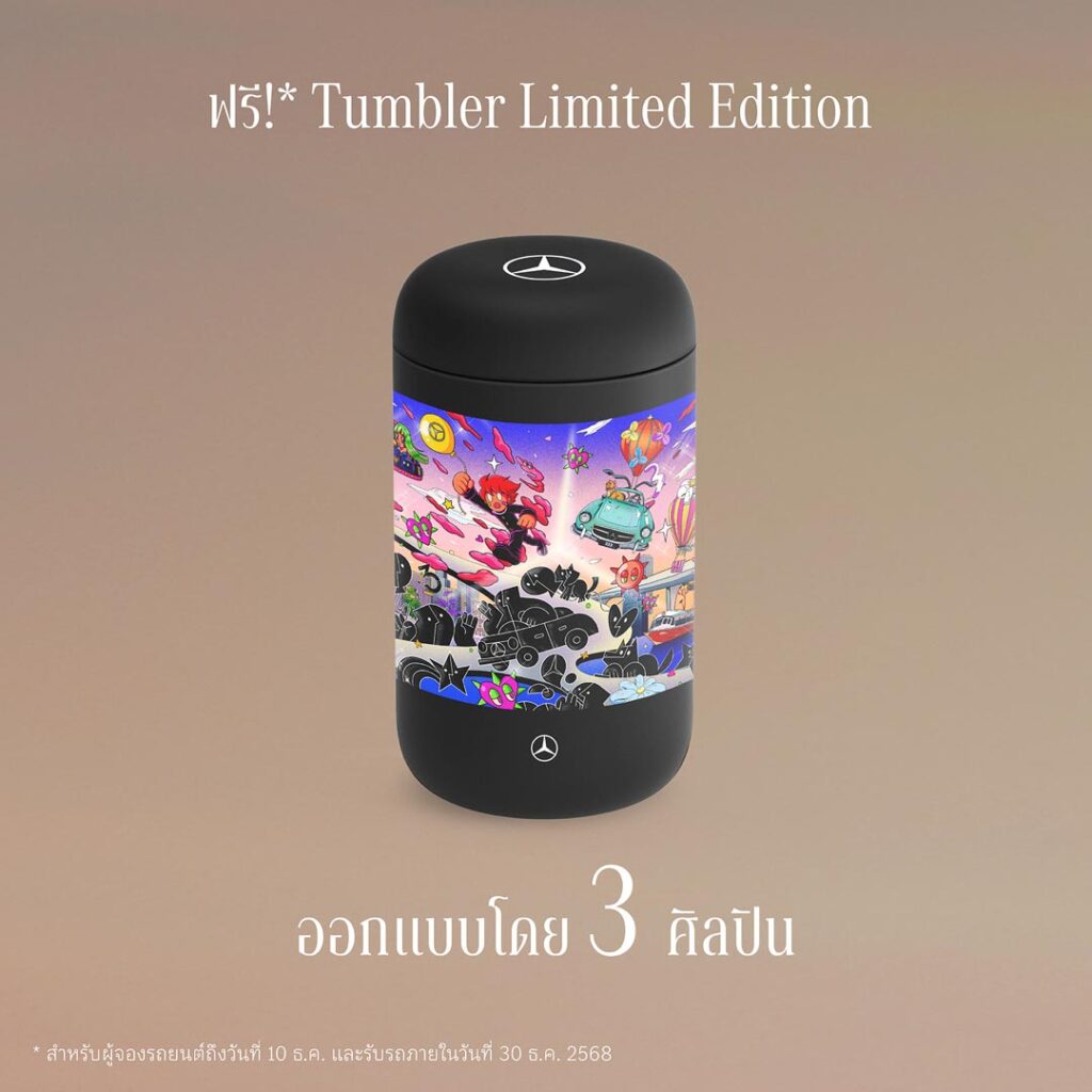 และสำหรับลูกค้าที่จองรถยนต์เมอร์เซเดส-เบนซ์ ทุกรุ่น ในงาน จะได้รับกล้อง Mercedes-Benz Drive Recorder 360° มูลค่า 16,500 บาท* และของสมนาคุณสุดพิเศษ Tumbler Limited Edition ที่ออกแบบโดยศิลปินรุ่นใหม่ทั้ง 3 ท่าน ได้แก่ “Jeff Aphisit” “Bomfha” และ “MR.HALFMAN”