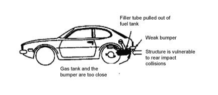 เพราะถังน้ำมันอยู่ติดท้ายรถมากเกินไป จนเกิดเหตุน่าสลดขึ้นเมื่อมันเคยเกิดอุบัติเหตุร้ายแรงจนผู้ขับขี่บาดเจ็บสาหัส และเกิดการฟ้องร้องกันขึ้น และศาลก็ออกคำสั่งให้ Ford ต้องยกเลิกการผลิตรถรุ่นนี้ และเสียค่าปรับไปกว่า 125 ล้าน USD หรือ 2,500 ล้านบาท