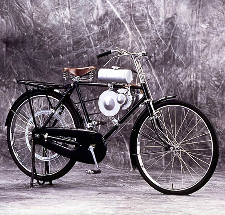 สภาพการคมนาคมในญี่ปุ่นหลังสงครามนั้นเป็นไปด้วยความย่ำแย่มาก เพราะขาดแคลนน้ำมันอย่างหนัก ผู้คนส่วนใหญ่ต้องเดินทางด้วยการเดิน หรือปั่นจักรยาน เมื่อ Soichiro เห็น Sachi ที่ต้องลำบากลำบนขี่จักรยานกลับจากซื้อกับข้าว เขาจึงเดินไปรื้อหาของเก่าๆ จนเจอเข้ากับเครื่องปั่นไฟของกองทัพญี่ปุ่นที่ใช้จ่ายพลังงานให้กับวิทยุไร้สาย ก็นำมา DIY เป็นเครื่องยนต์ 2 จังหวะขนาด 50 cc ขับเคลื่อนด้วยสายพาน มาติดตั้งบนจักรยานของ Sachi และยังนำขวดน้ำมาติดตั้งเป็นถังน้ำมัน