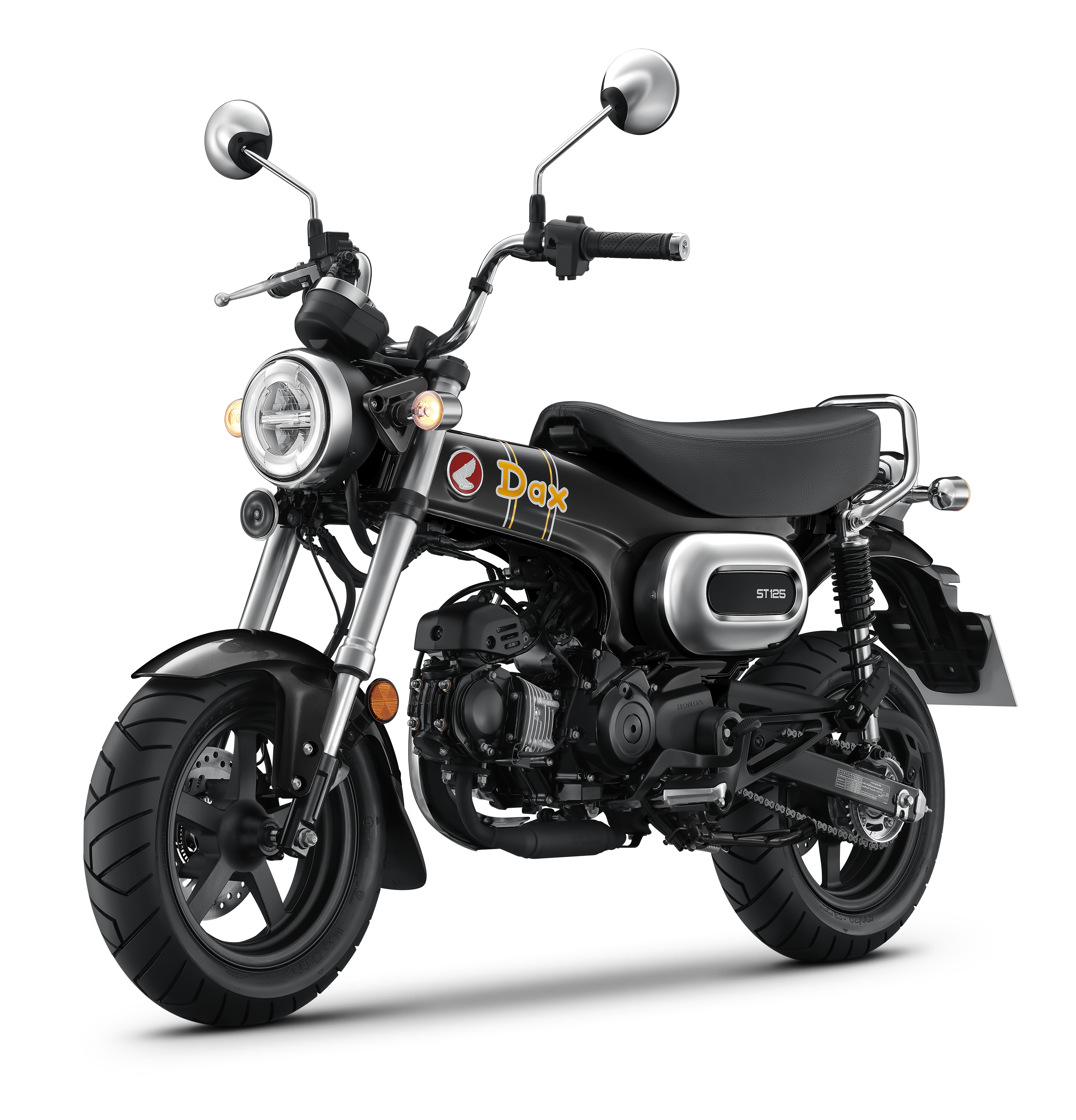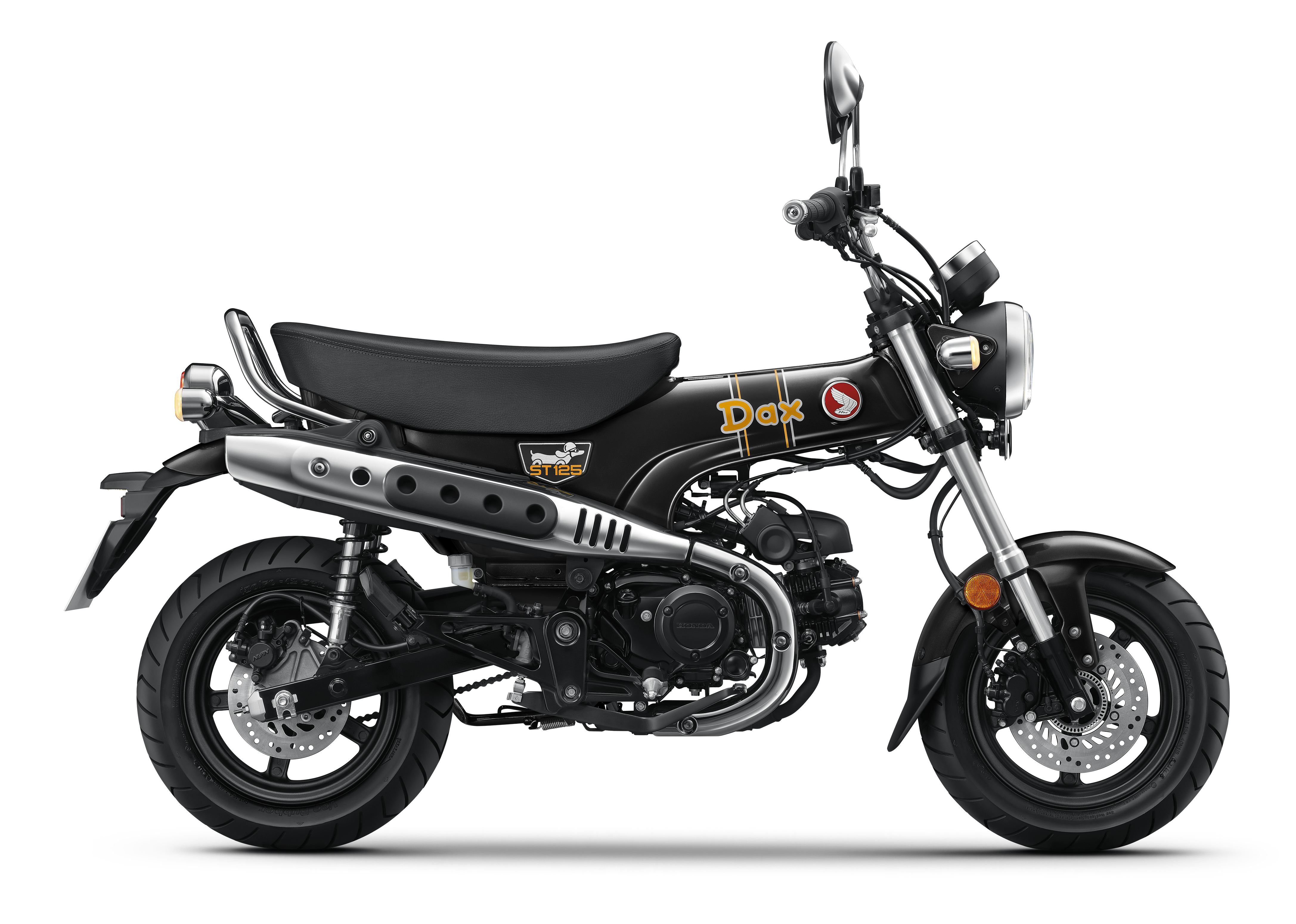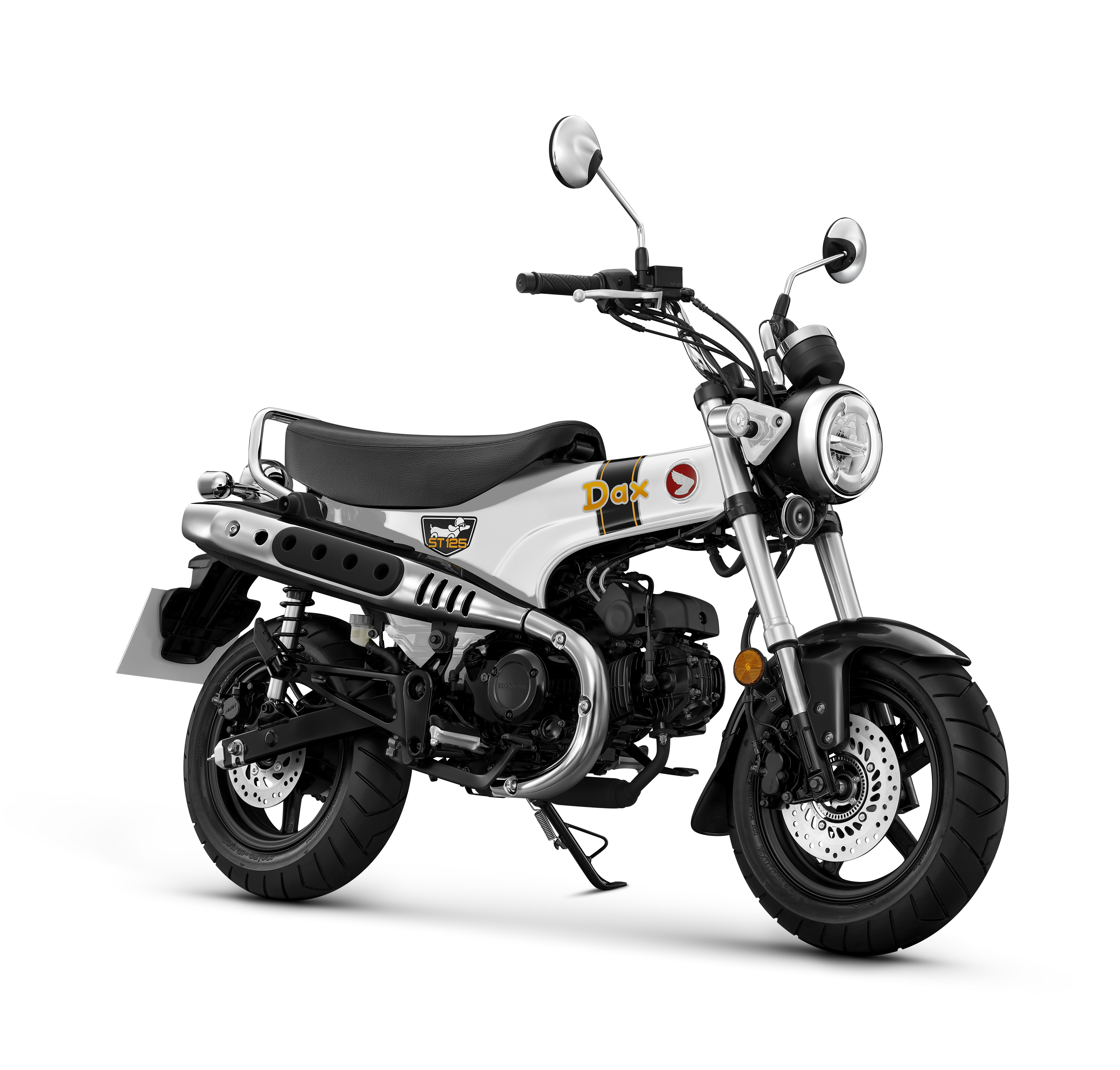 New Honda Dax ยังคงเอกลักษณ์ดีไซน์ที่สืบทอด DNA จากรุ่นต้นแบบ ด้วยโครงสร้างเฟรมเหล็กแบบ T-BONE พร้อมเบาะนั่งตอนเดียวแบบ 2 ที่นั่ง ที่ออกแบบให้รองรับทั้งผู้ขับขี่และผู้โดยสารได้อย่างสะดวกสบาย อันเป็นซิกเนเจอร์ของตระกูล Dax เสริมด้วย เอมเบลมรหัส ST125 และสัญลักษณ์ น้องหมาดัชชุน ที่บ่งบอกตัวตนความออริจินัลได้อย่างโดดเด่น พร้อมโลโก้ Honda แบบคลาสสิก นอกจากนี้ยังมาพร้อม ท่อไอเสียแบบยกสูง อีกหนึ่งดีไซน์เอกลักษณ์สำคัญของ Dax และ ไฟหน้าทรงกลมขนาดใหญ่ ที่คงเสน่ห์ความคลาสสิกแบบต้นฉบับ พร้อมให้ทั้งความสวยงามและทัศนวิสัยในการขับขี่ที่ชัดเจน
