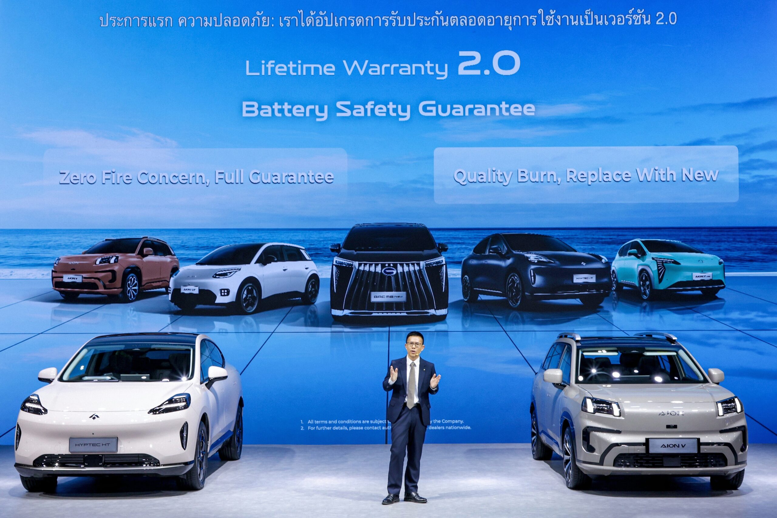 - ความเชื่อมั่นขั้นสูง (Advanced Assurance): ขับเคลื่อนด้วยคุณภาพอันดับ 1 จาก J.D. Power โดยมีไฮไลต์สำคัญคือการยกระดับความปลอดภัยขั้นสูงสุดด้วยการอัปเกรดการรับประกันเป็น Lifetime Warranty 2.0 ภายใต้แนวคิด “ความมุ่งมั่นไร้กังวลเรื่องอัคคีภัย และคำมั่นสัญญาการรับประกันเต็มรูปแบบ” (Zero Fire Concern, Full Guarantee Promise) ซึ่งถือเป็นการรับประกันขั้นสูงสุดของแบรนด์ โดย GAC ให้คำมั่นสัญญาว่า หากเกิดเหตุไฟไหม้ที่มีสาเหตุมาจากคุณภาพของแบตเตอรี่ บริษัทฯ จะทำการเปลี่ยนรถยนต์คันใหม่ให้แก่ลูกค้าทันที รวมถึงการรับประกันตลอดอายุการใช้งานที่ครอบคลุมชิ้นส่วนหลักทั้ง แบตเตอรี่ขับเคลื่อน มอเตอร์ขับเคลื่อน และกล่องควบคุมมอเตอร์ไฟฟ้า เพื่อมอบความอุ่นใจสูงสุดในทุกการเดินทาง