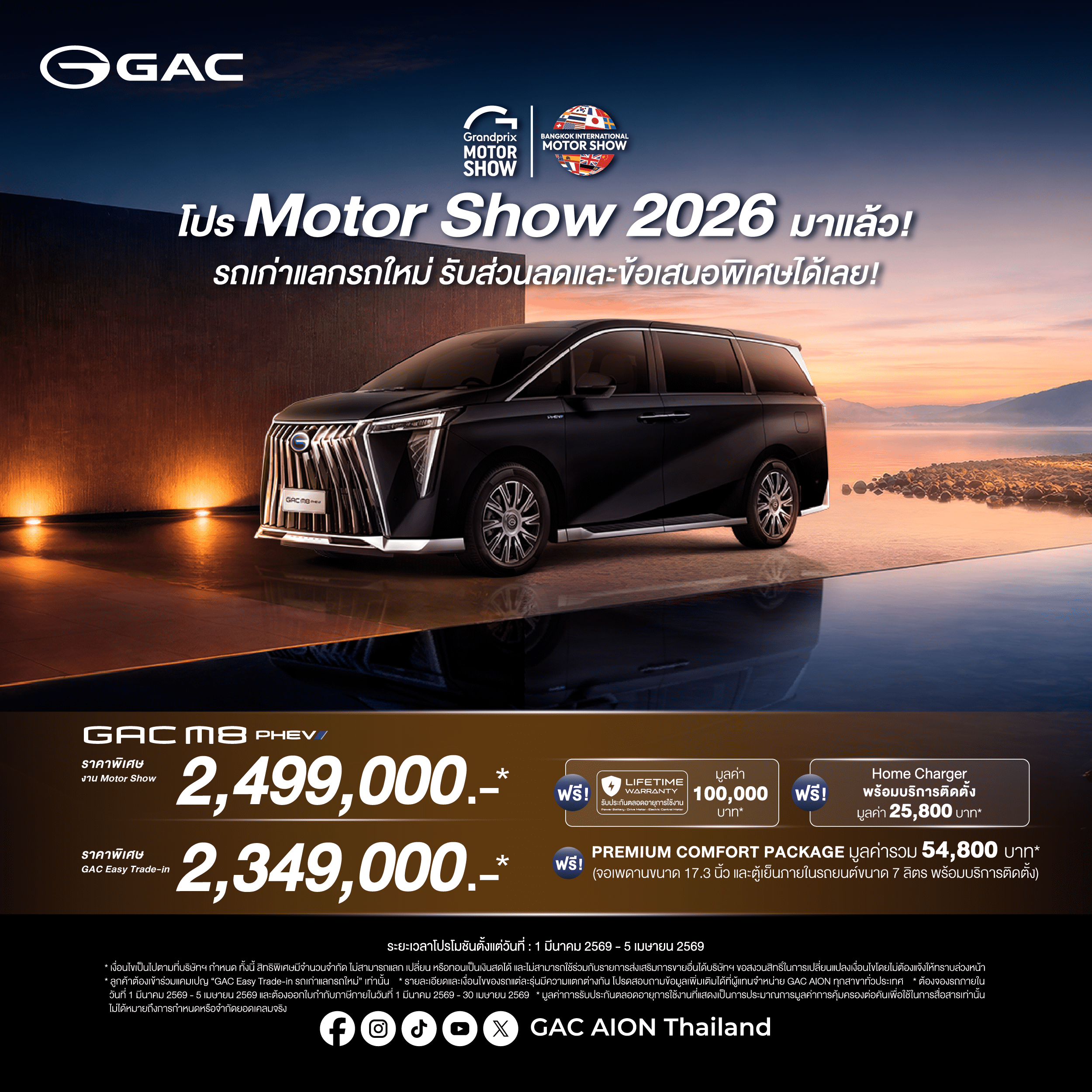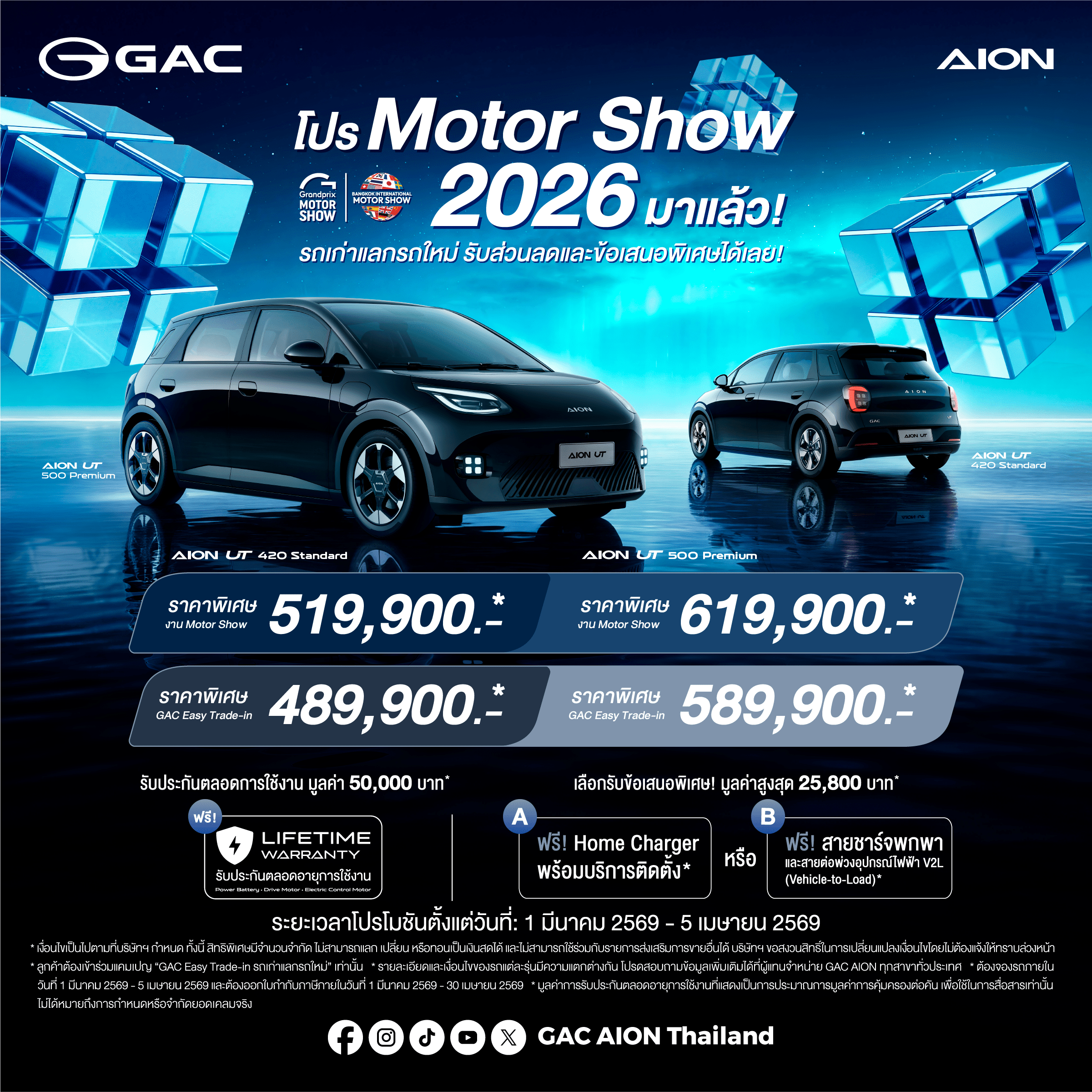 เพื่อเป็นการขอบคุณลูกค้า GAC AION Thailand มอบสิทธิพิเศษ สำหรับลูกค้าที่จองรถตั้งแต่วันที่ 1 มีนาคม 2569 – 5 เมษายน 2569 และต้องออกใบกำกับภาษีภายในวันที่ 30 เมษายน 2569