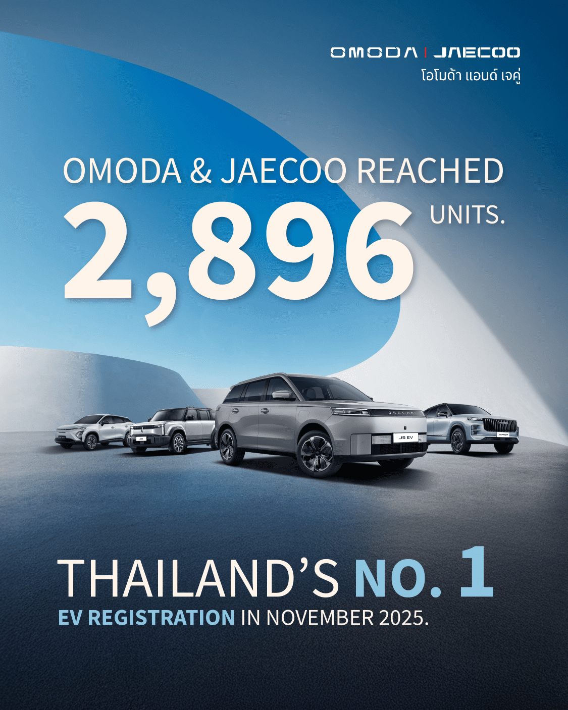 OMODA & JAECOO (อ่านว่าโอโมด้า แอนด์ เจคู่) ผู้นำด้านนวัตกรรมยานยนต์พลังงานไฟฟ้าระดับพรีเมียม ประกาศความสำเร็จครั้งสำคัญ หลัง OMODA & JAECOO สามารถคว้าอันดับ 1 ยอดจดทะเบียนรถไฟฟ้าในประเทศไทยประจำเดือนพฤศจิกายน 2568 โดยส่วนใหญ่เป็นรุ่น JAECOO 5EV สะท้อนความเชื่อมั่นของผู้บริโภคที่มีต่อแบรนด์