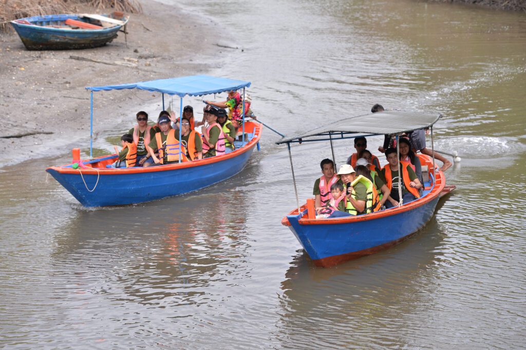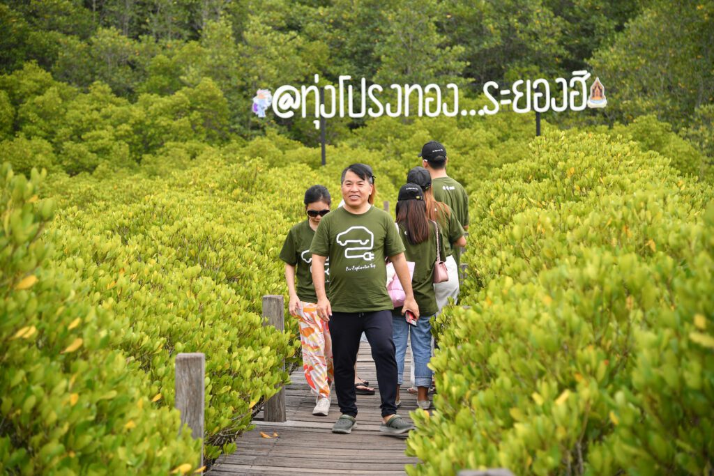 หลังจากอิ่มหน่ำสำราญกันเรียบร้อย เราได้ออกเดินทางอีกครั้งกับเส้นทางสายสั้นๆ เพื่อมุ่งหน้าสู่ “ทุ่งโปรงทอง” ป่าชายเลน ที่เกิดจากความร่วมมือร่วมใจของเทศบาลและชาวบ้าน ในการฟื้นฟูต้นไม้และระบบนิเวศ จนกลายเป็นสถานที่ท่องเที่ยวเชิงอนุรักษ์ยอดนิยมของจังหวัดระยอง โดยเปลี่ยนจากขับรถมานั่งรถพวงข้าง เพื่อเดินทางไปยังท่าเรือแสมผู้ นั่งเรือหางยาวล่องไปตามคลองแสมผู้ ที่มีความยากว่า 3 กม.สัมผัสวิถีชีวิตชาวบ้านริมลอง ก่อนลัดเลาะไปตามป่าชายเลน ชมทัศนียภาพที่สวยงามแปลกตาของต้นโกงกาง ต้นแสม ต้นลำพู ที่อุดมสมบูรณ์ และเป็นที่อยู่อาศัยของสัตว์ทะเล กุ้ง หอย ปู ปลาตีน ทั้งสัมผัสธรรมชาติของท้องทะเลอ่าวไทย