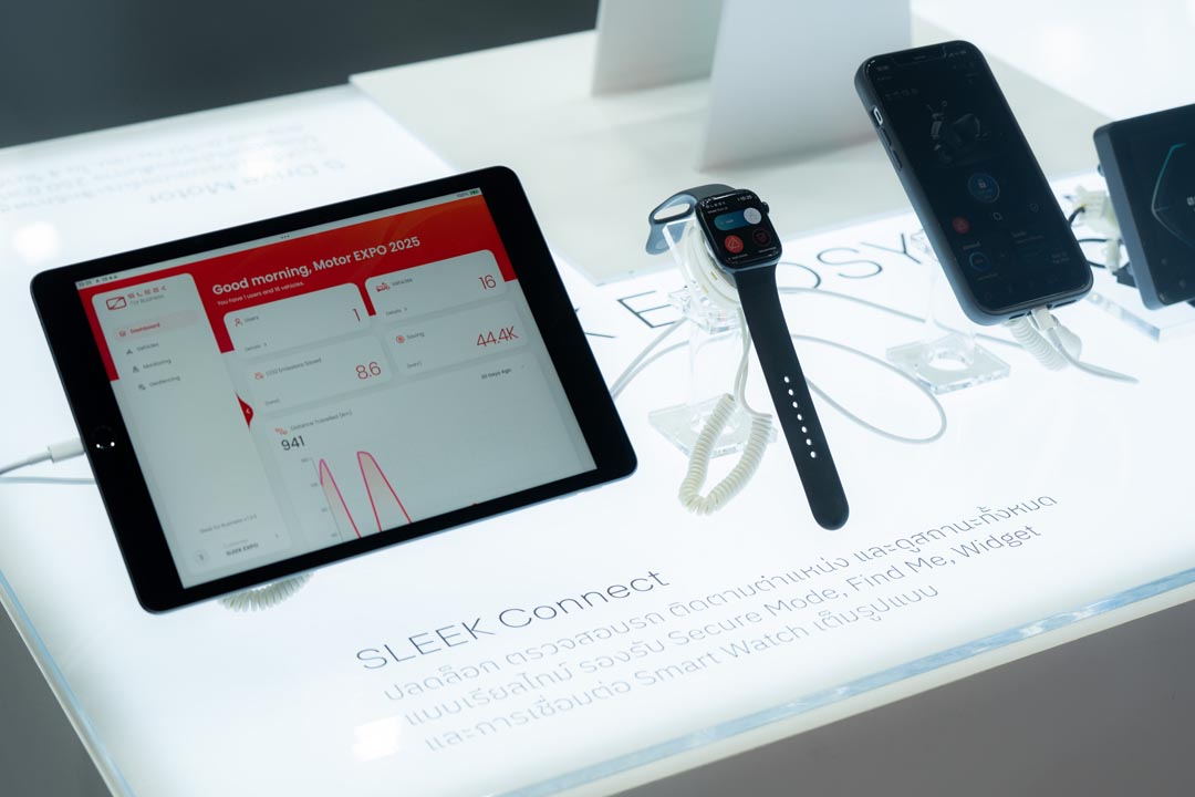 อีกหนึ่งไฮไลต์สำคัญคือ SLEEK OS ซอฟต์แวร์ศูนย์กลางที่เชื่อมต่อรถ ผู้ขับ และโครงสร้างพื้นฐานเข้าด้วยกัน ผ่าน SLEEK App ที่ควบคุมรถได้เกือบทุกฟังก์ชัน รวมถึงการสตาร์ท เปิดเบาะ เช็กสถานะรถ วิเคราะห์ปัญหา และแชร์ตำแหน่งแบบเรียลไทม์ พร้อมรองรับการสั่งงานผ่าน Apple Watch และ Android Watch เป็นครั้งแรกในประเทศไทย มากไปกว่านั้นสำหรับภาคธุรกิจ สลีคขอนำเสนอโซลูชัน Fleet Management ที่ช่วยให้ติดตามและบริหารรถหลายคันได้ในอุปกรณ์เดียวด้วยการเชื่อมต่อแบบหลายซิมทั้งบนรถและในแบตเตอรี่ แม้ถอดแบตออกก็ยังรู้ตำแหน่งได้ทันที